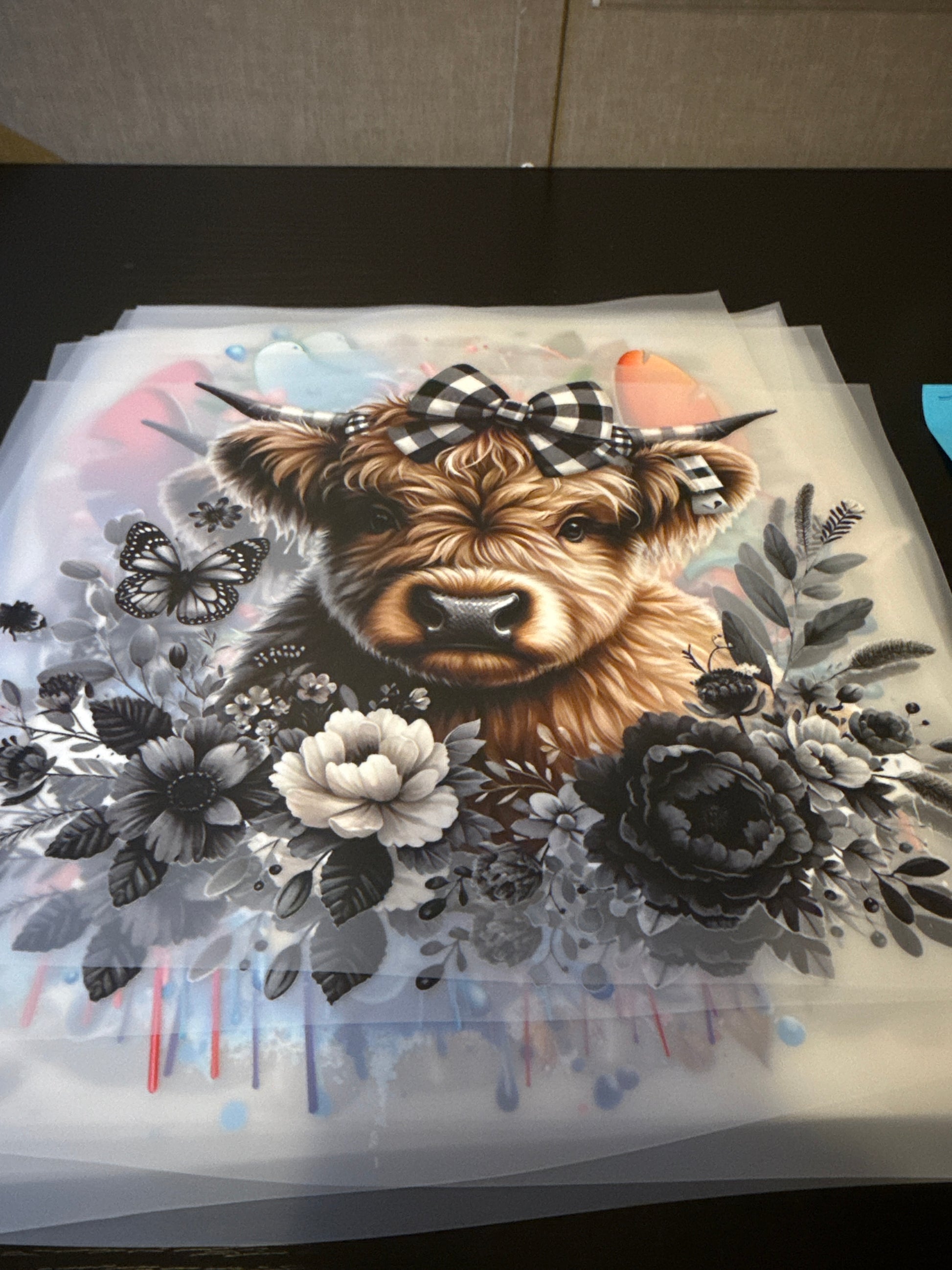 2 adult black and white checkered highland cow